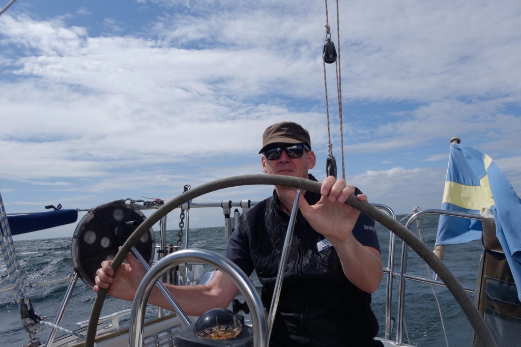 Det kändes aldrig farligt eller läskigt men det var tungt att styra i de stora vågorna som rullade in snett från sidan och blev större och större allteftersom timmarna gick.. Vi delade upp styrningen så att vi styrde 30 minuter och sedan bytte. Varje gång jag blev avlöst darrade vänster lår av ansträngningen.