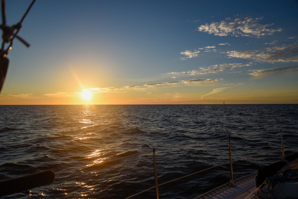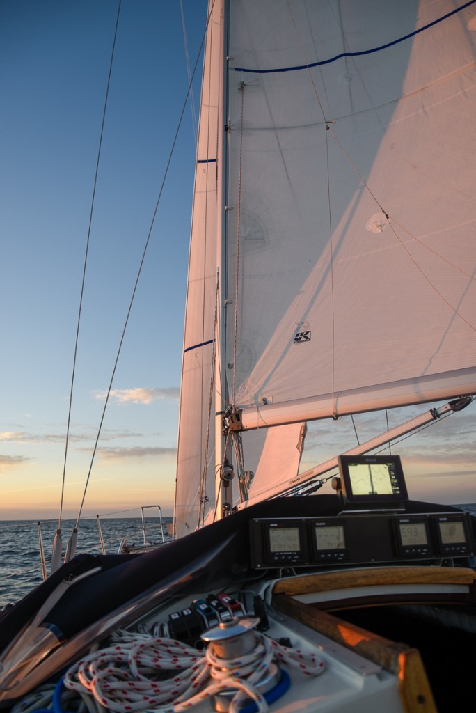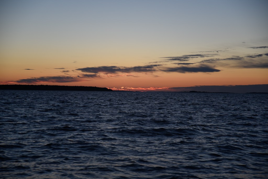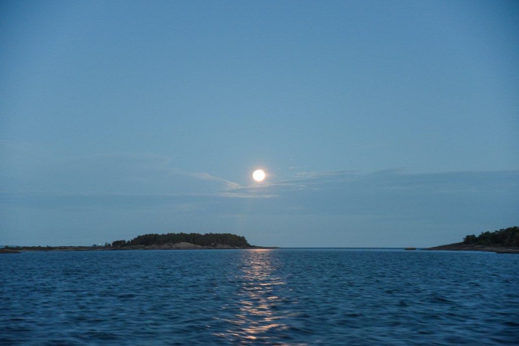 Där i gryningen ute på Finska Viken fick vi uppleva att segla mot en soluppgång samtidigt som månen gick ner bakom oss. Det var häftigt.