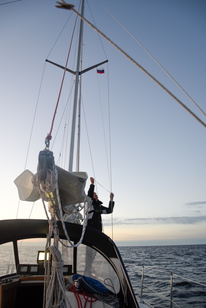 Det blåste mellan 4 och 7 m/s nordvästlig vind i stort sett hela sträckan.Innan vi satte segel bytte vi vår finska gästflagga mot den ryska.