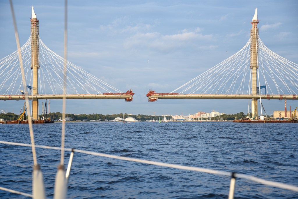 Men precis innan man kommer fram till båtklubben passerar man numera under en bro som inte är färdigbyggd. Den står alltså inte med på sjökorten, varken i papper eller elektroniska. Vi har i efterhand tagit reda på att den segelfria höjden kommer att vara 25 meter när bron är klar. Vi seglade under den lilla öppning som fanns kvar innan de olika delarna ännu hunnit sättas ihop. Vi hade ju kunnat köra även på andra ställen men ingenstans stod den segelfria höjden så det kändes bra att gå där det fanns en öppning.