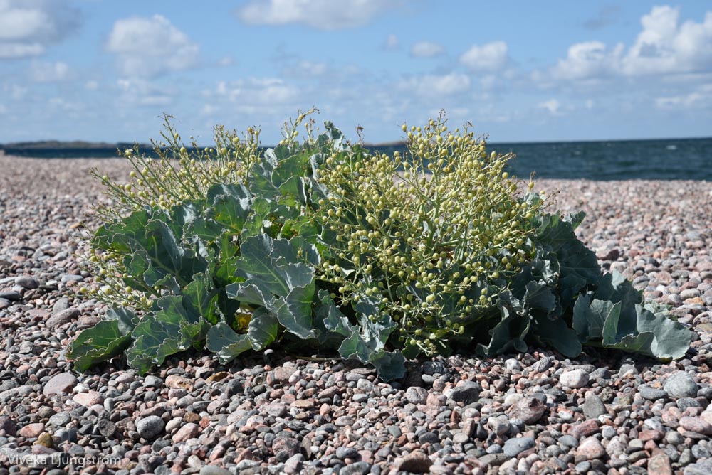 Strandkål Crabe maritima på latin. Relativt ovanlig på ostkusten. Linné skrev i sin västgötska resa, som också gick till västkusten, att soldater som ätit strandkål hade blivit ”fjolliga”. Man undrar lite hur de blev då.