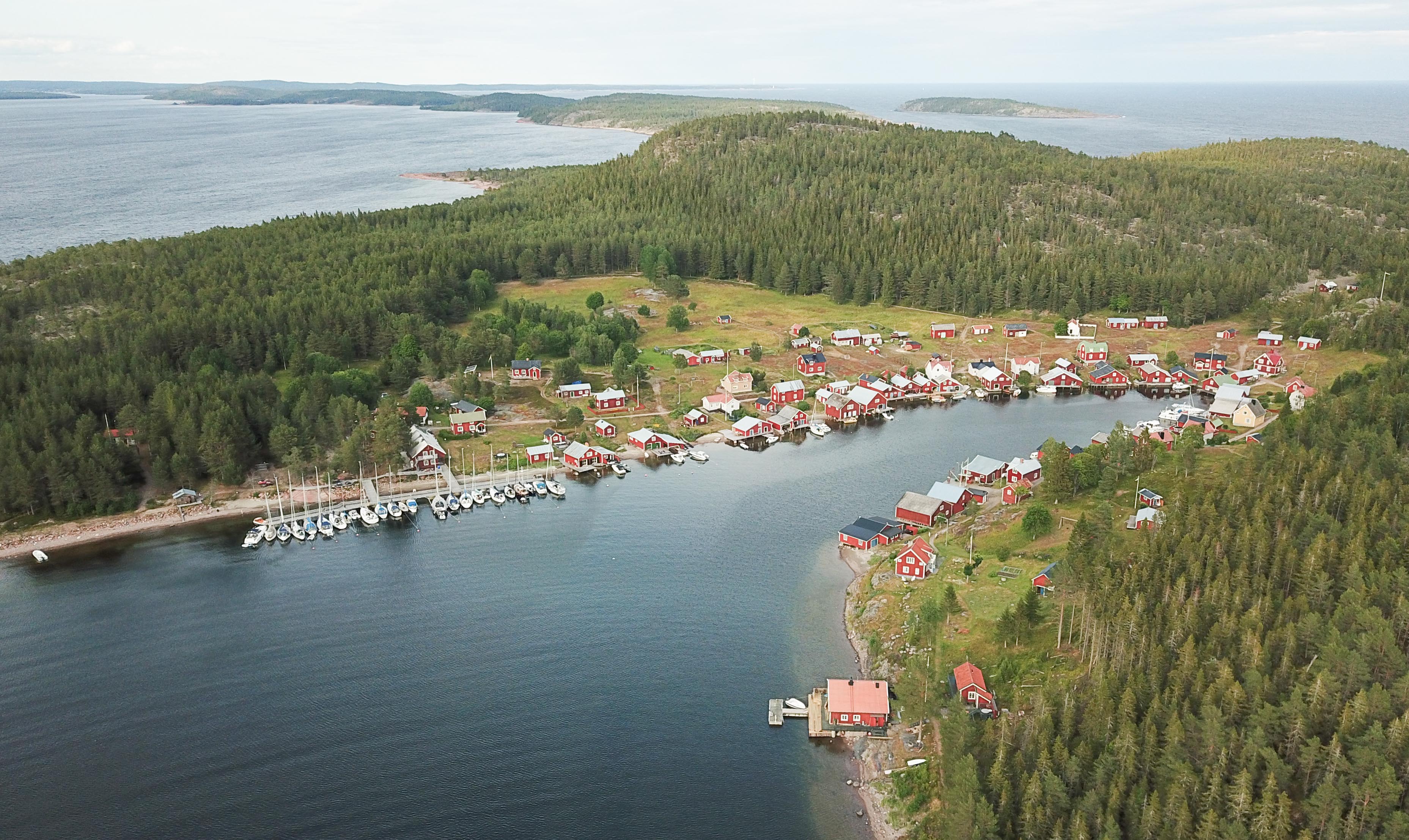 Alla husen i byn ligger utmed vattenbrynet i viken. Det mesta är numera sommarbostäder.