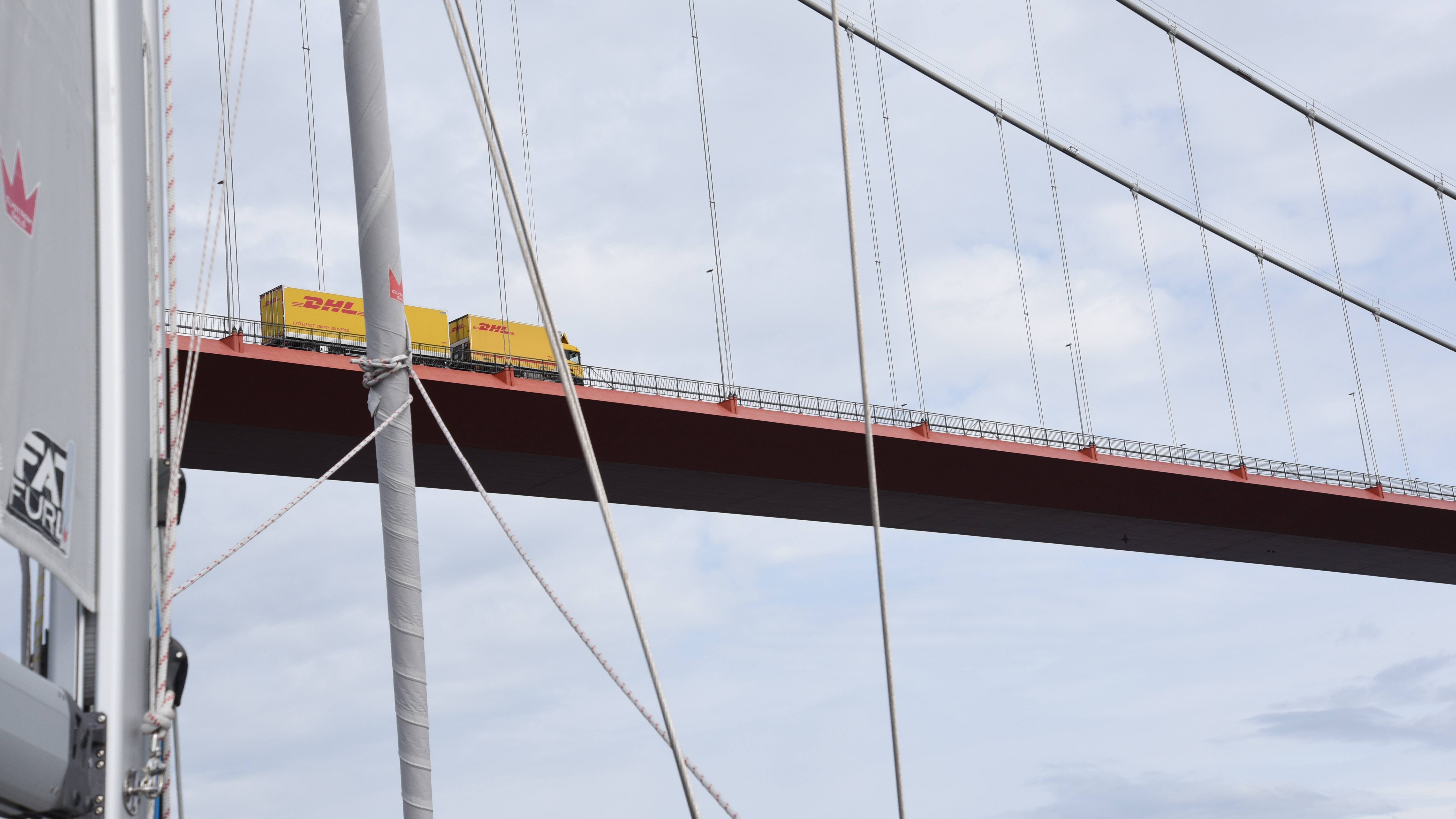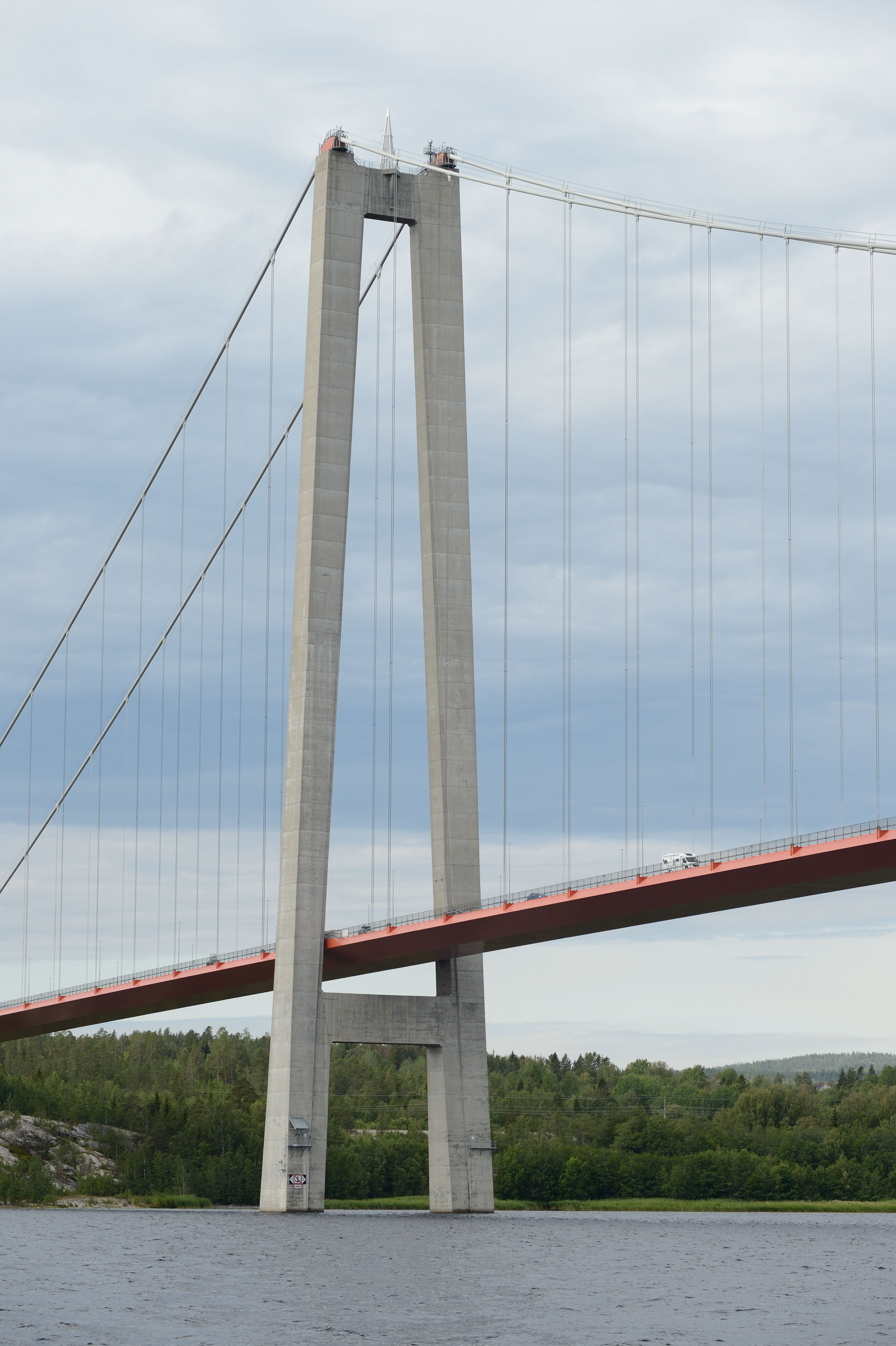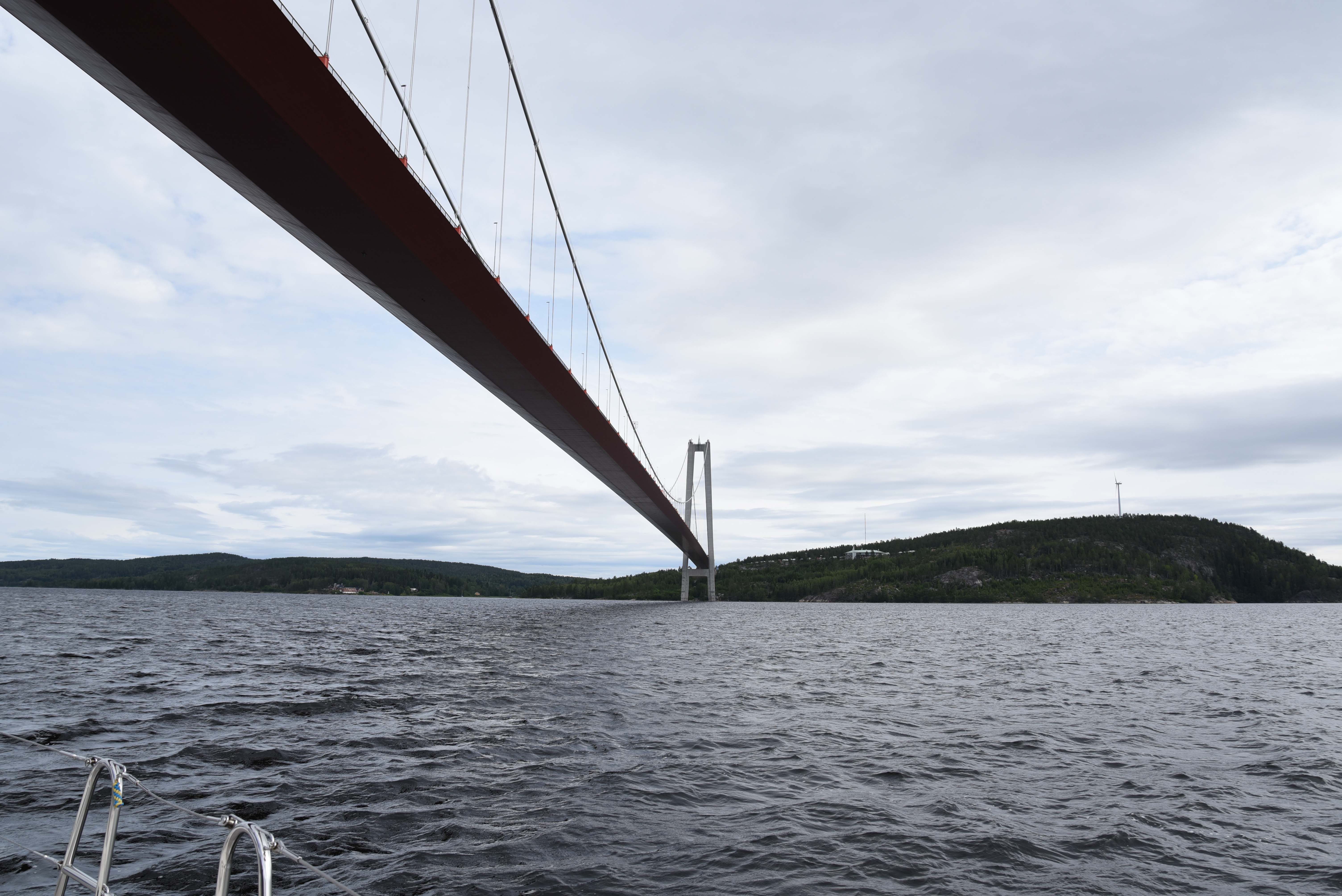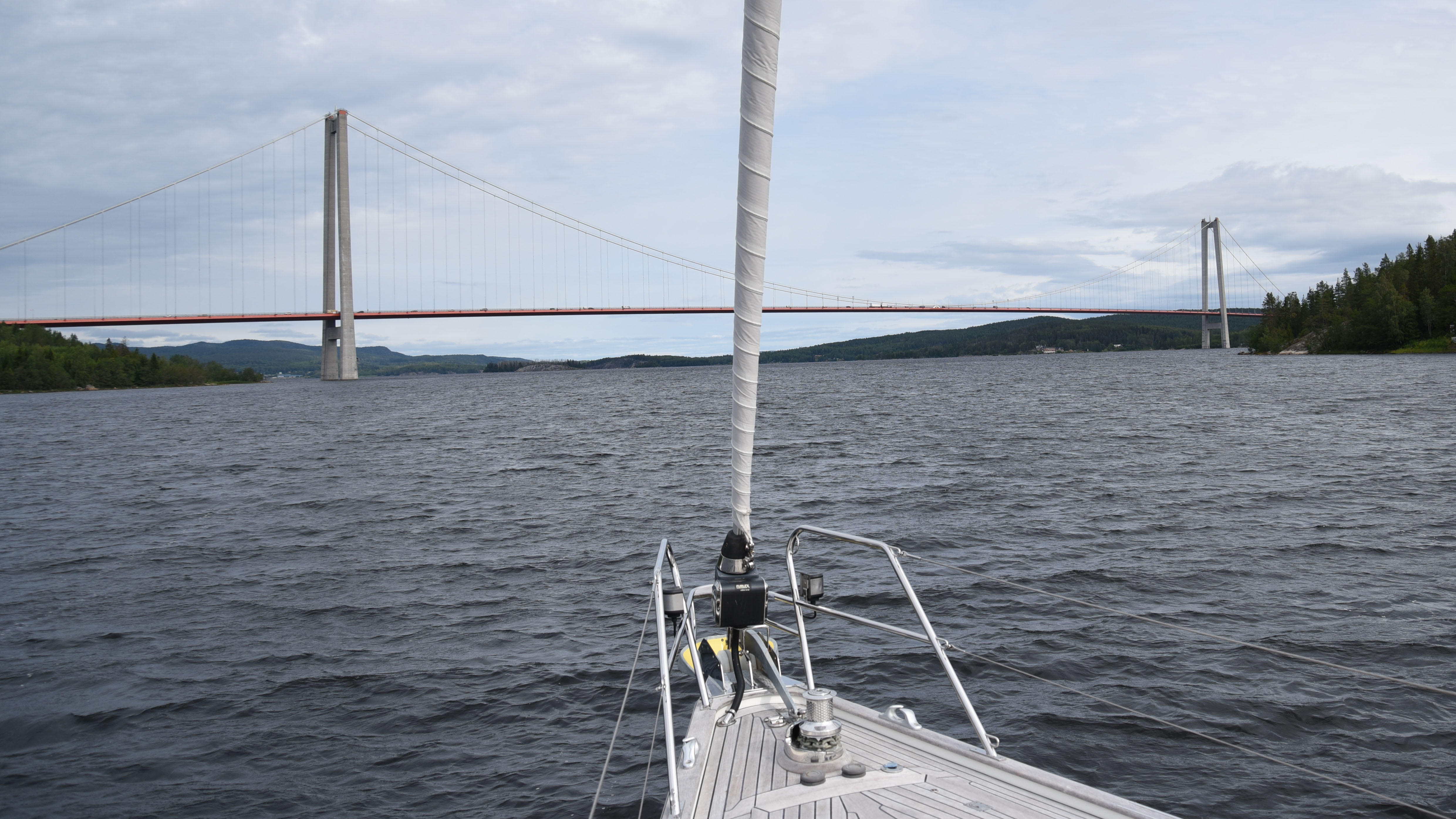 Vi kastar loss klockan 8 och ställer kosan norrut. Fortfarande nordliga vindar men bitvis vrider de över på nordost så att vi faktiskt kan segla. Vi börjar med att segla lite åt fel håll för att få se Höga Kusten-bron.