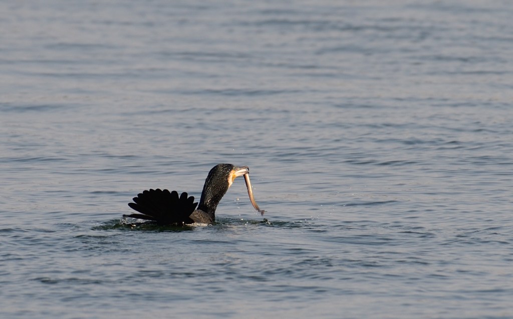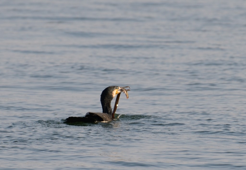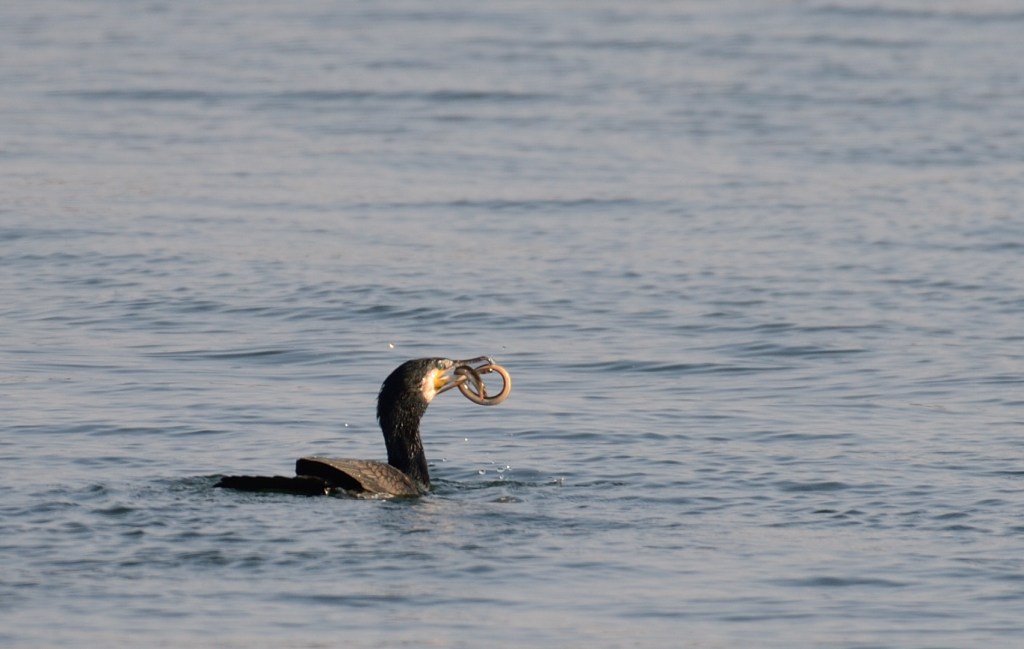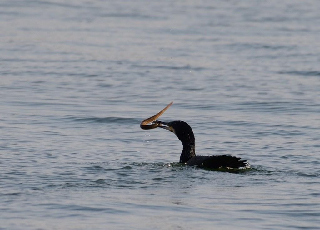 Den största happeningen under dessa dagar är att vi får se en ålakråka, eller skarv, äta upp en ål. Och den äter den inte bara en gång utan två! Första gången hinner vi bara ta några skruttiga bilder med mobilen och tänker inte mer på det. Men då spottar den plötsligt ut ålen, eller om ålen lyckas ta sig ut och då har Erik hunit få fram en kamera med lite större objektiv.