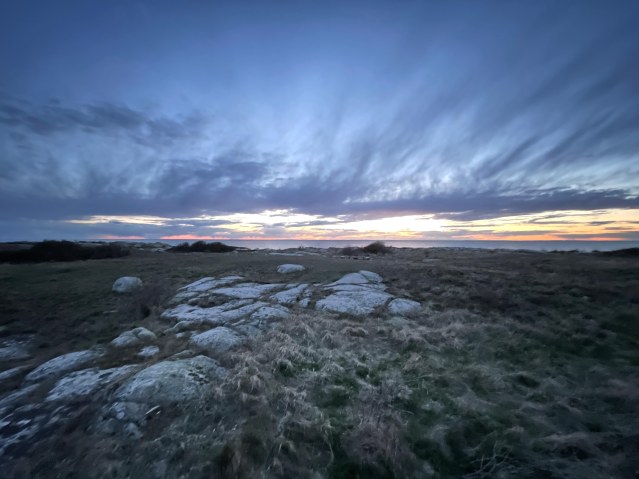 På höjden ovanför Kåseberga ligger Ale stenar – en skeppsättning med en ännu inte helt klarlagd bakgrund. Det är mäktiga stenar som människor en gång har gjort sig besväret att transportera hit och ställa upp i en skeppsform. På Wikipedia läser jag att platsen ibland används av new age-personer, moderna häxor och andliga personer. När vi kommer upp på höjden håller en mycket liten grupp personer på med någon slags rit, de nynnar och spelar på trummor, vandrar mellan stenarna och skakar på något som ser ut som snäckskal trädda på snören. Vi försöker att inte störa dem men vill förstås också ha vår del av stenarna så vi smyger omkring med våra kameror till suggestivt trummande. Det visar sig att det är fullmåne idag och inte i går som vi trott och det är väl därför de är här.
