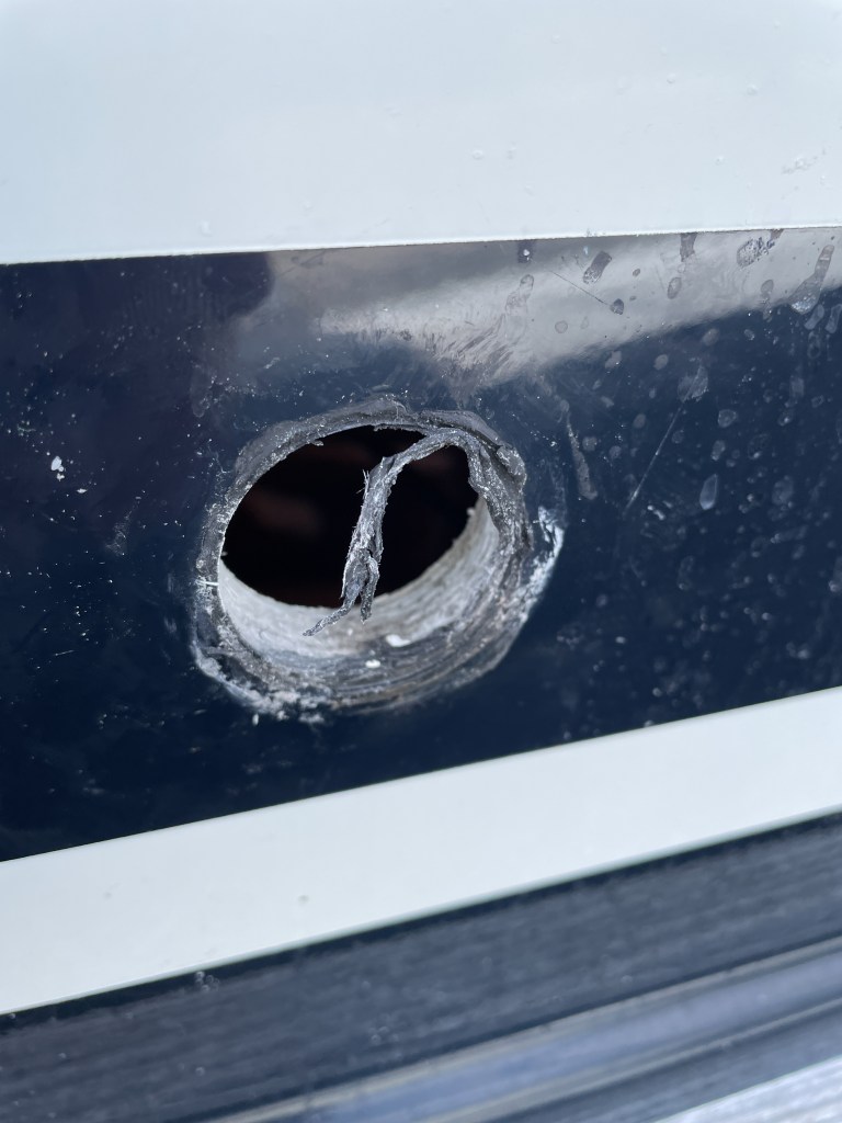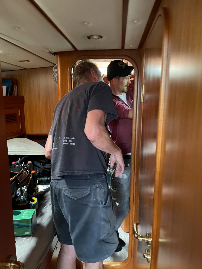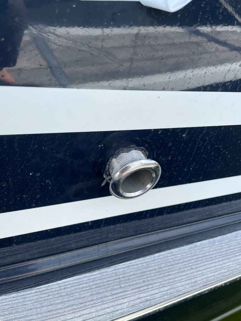 Skrovgenomföringen till septikanken ska fixas. De som satte dit den gjorde verkligen ett slarvigt jobb. Vi är glada att vi upptäckte det nu och inte efter en atlantöverfart.