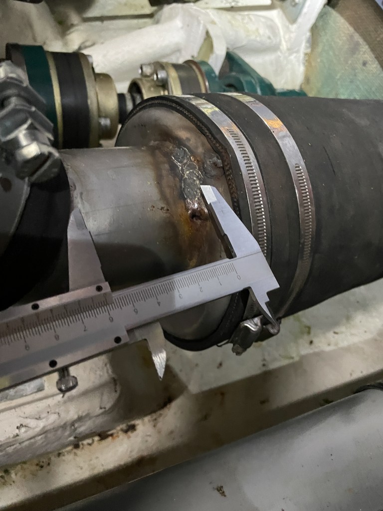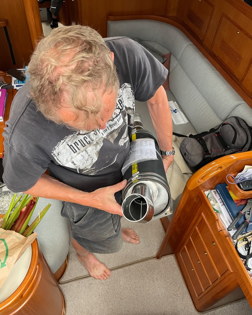 Felsökningen kring varför det ryker om motorn fortsätter. Vi upptäcker att ljuddämparen som vårt varv på ostkusten (ja samma varv som slarvade med tank och genomföring) lagade i våras visar sig ha spruckit i skarvarna. Vi bestämmer oss för att beställa en ny som Erik monterar.