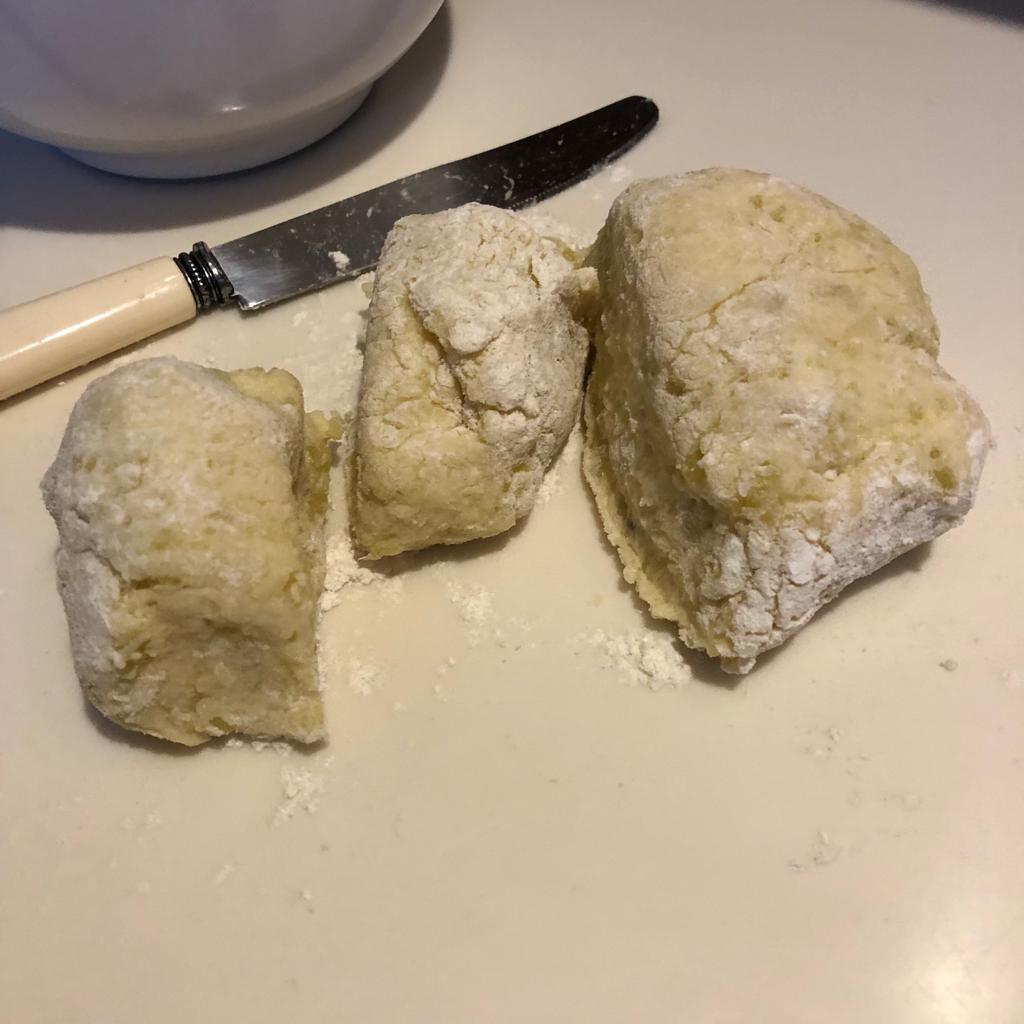 Koka potatisen och låt den svalna så pass att den kan skals. Mosa potatisen och blanda ner smör och salt. Tillsätt sedan vetemjöl, lite i taget. Den kan vara lite klibbig när du börjar kavla eftersom det är lättare att kavla om du kan ha nytt mjöl på bordet varje gång du vänder.